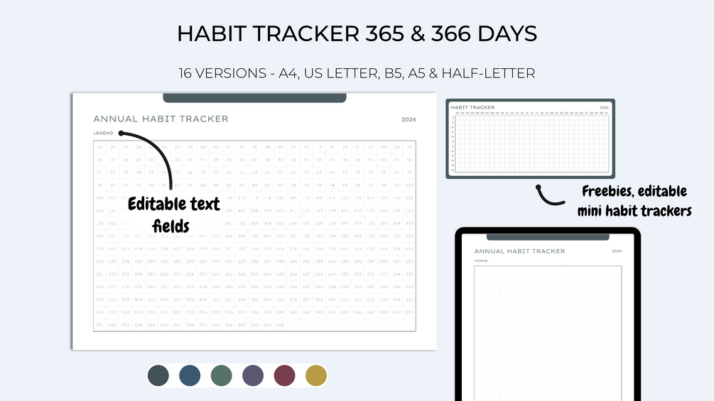 Printable & digital annual habit tracker 365 & 366 days | Editable yearly habit tracker | Minimalist style | Goodnotes, Notability, Xodo template