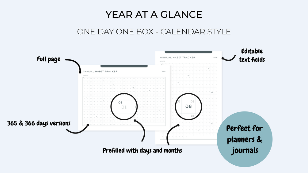 Track your habits, simply, all year round, with these minimalist digital and printable habit trackers 365 & 366 days.