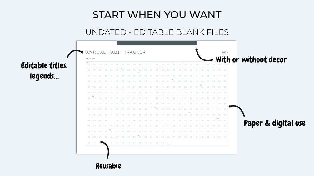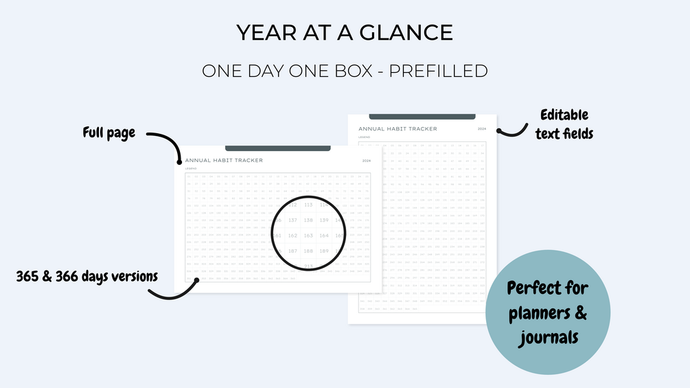 The tracker comes with 3 fill styles: completely blank, pre-filled from 1 to 365 (& 366), pre-filled with all months of the year.