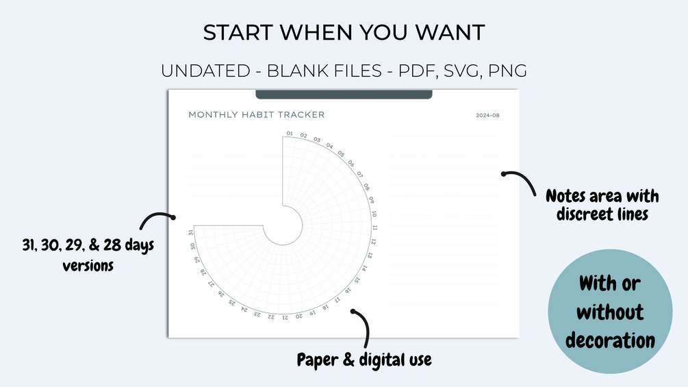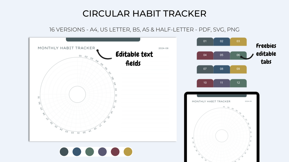 Printable & digital monthly circular habit tracker | Minimalist style | Multiple habits | Goodnotes, Notability, Xodo template