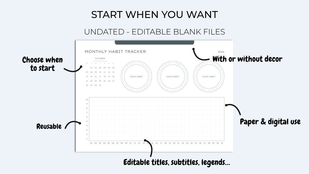 Printable & digital monthly habit tracker multi | Editable monthly habit tracker | Health tracker, sleep, hydration, menstrual cycle, anxiety, pain, medicine... | Minimalist style | Goodnotes, Notability, Xodo template