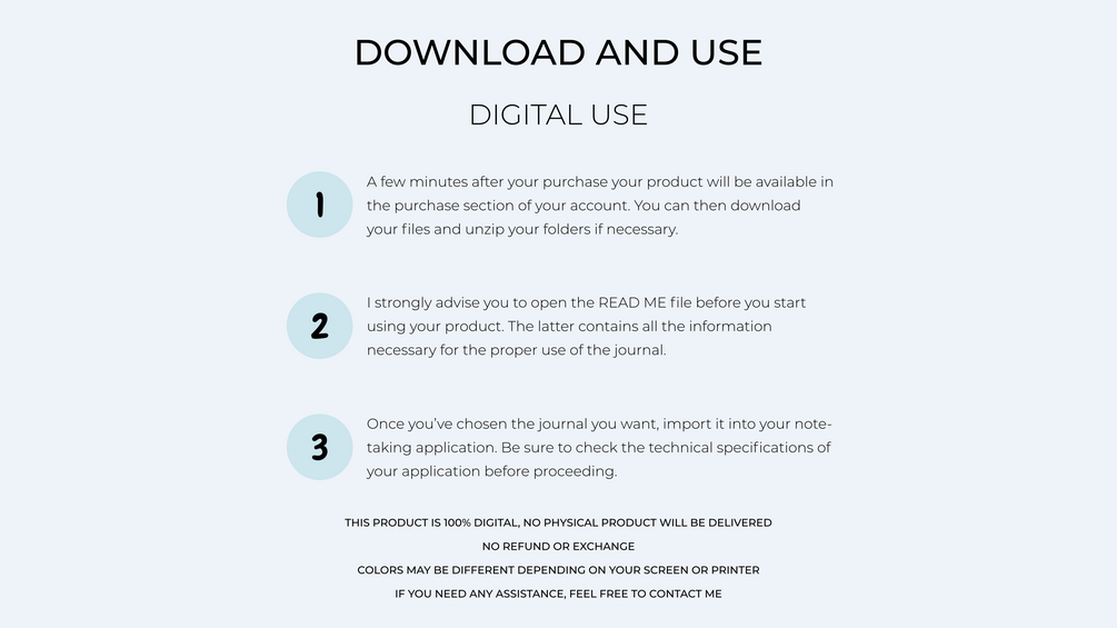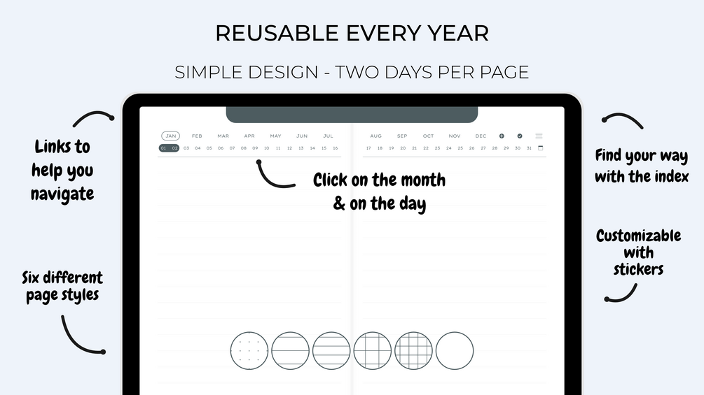 Easily navigate your journal thanks to the numerous links (index, month, days, stickers, etc.) and by creating your bookmarks. The presentation file will tell you in particular how to import your product after direct downloading and its different functionalities.