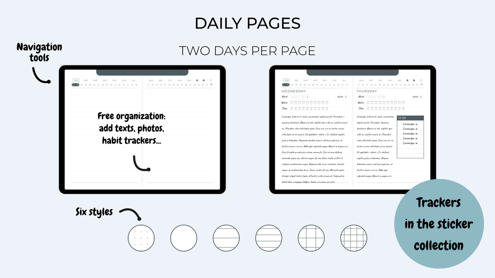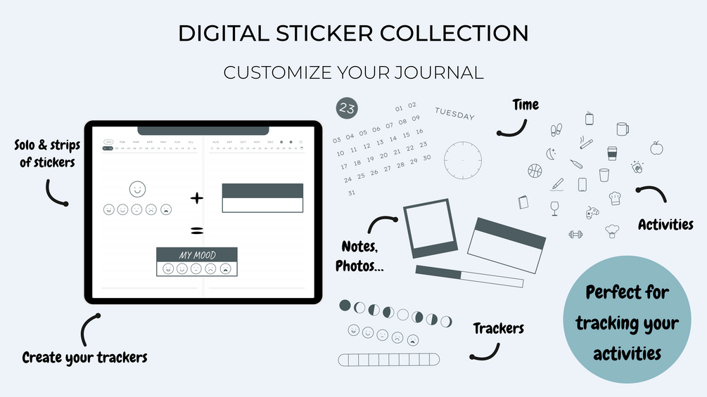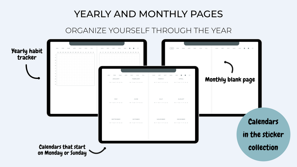 - a collection of stickers in PNG format: calendars, days of the week, days of the month, months of the year, notes, habit tracking icons...
