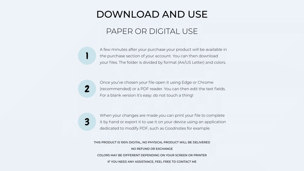 After your purchase, you can download the documents to your tablet or PC and modify them directly with a PDF editor or print the desired pages, bind them, glue them or put laminate them, to use them at your convenience.