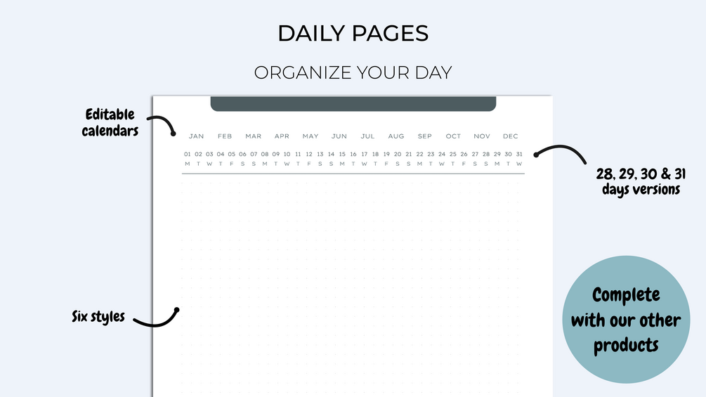 - Daily pages: dotted style, lined pages, squared pages, blank pages (in batches of 13 to fill the year in one go)
