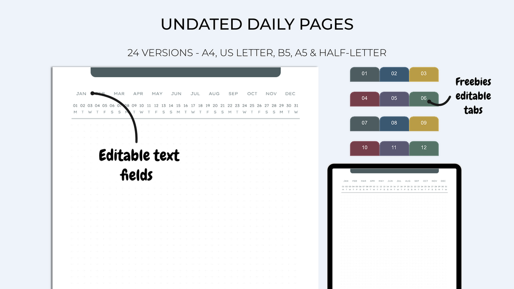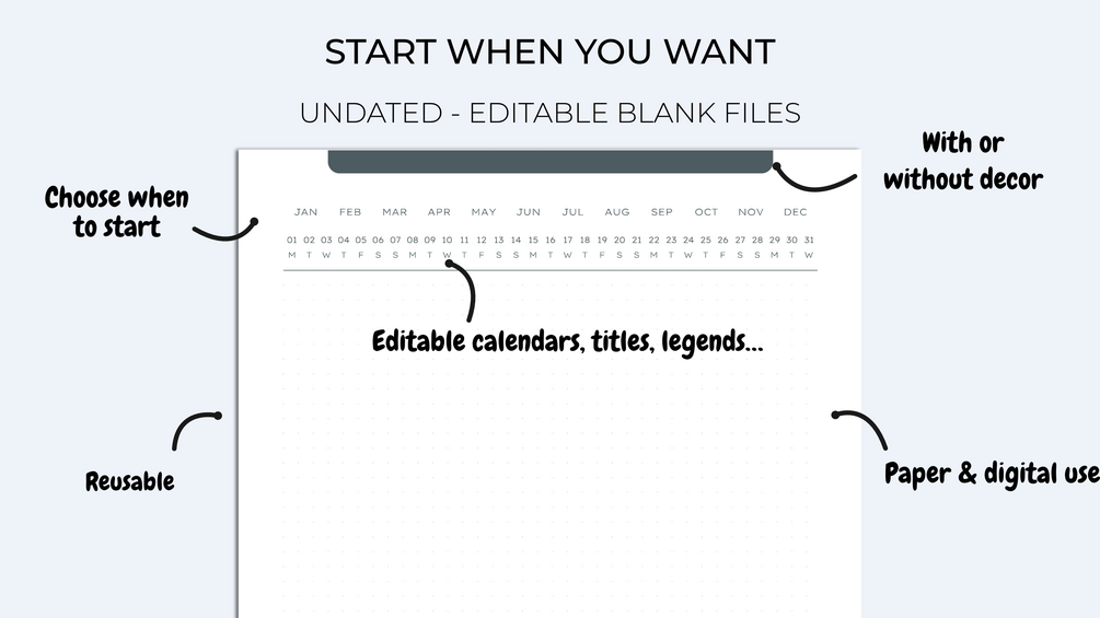 The files are empty of text and undated to allow you to fill them in at your convenience but also to reuse them for many years. Fill in the text fields from a PDF editor and create a planner that suits you and in your language.