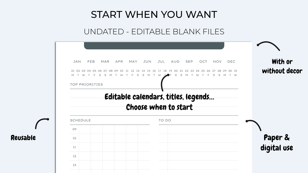 The files are empty of text and undated to allow you to fill them in at your convenience but also to reuse them for many years. Fill in the text fields from a PDF editor and create a planner that suits you and in your language.