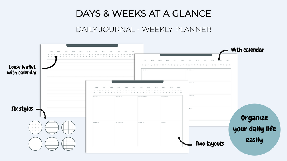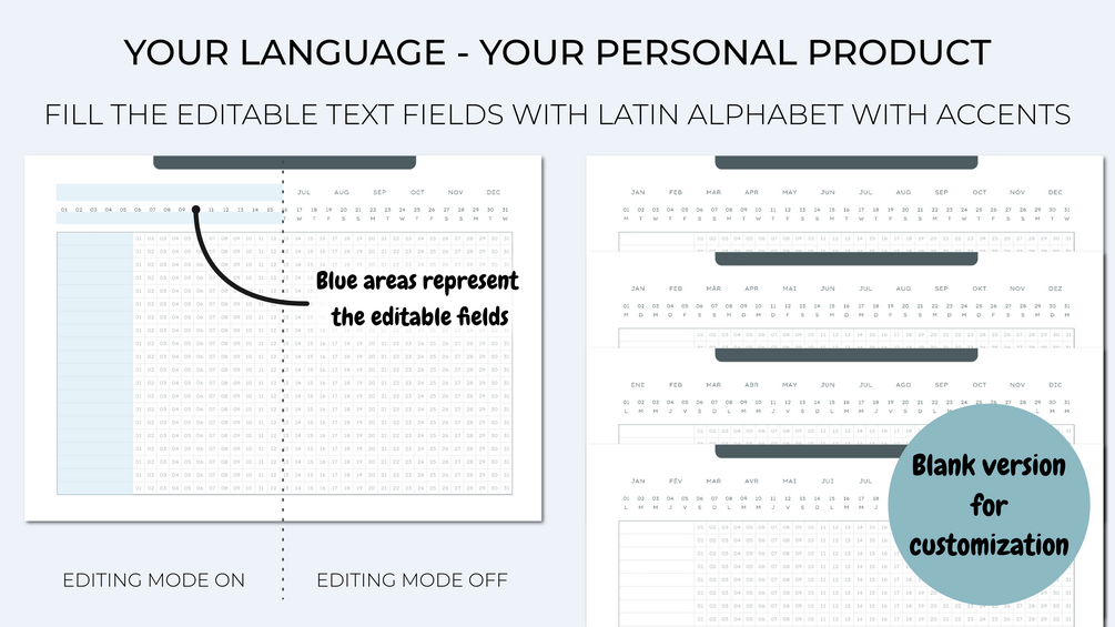 The files are empty of text and undated to allow you to fill them in at your convenience but also to reuse them for many years. Fill in the text fields from a PDF editor and create a planner that suits you and in your language.