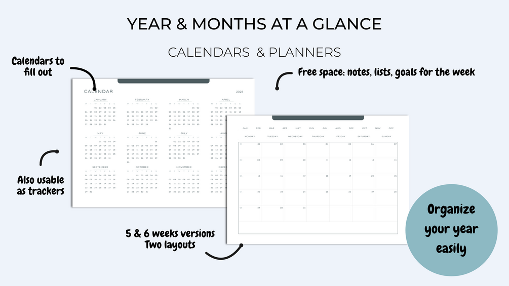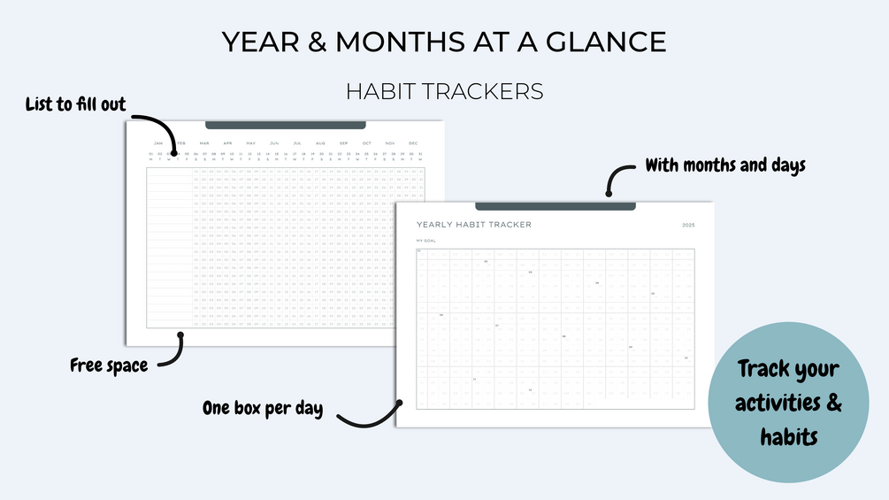 With these annual, monthly, weekly and daily pages, organize yourself throughout the year. Thanks to trackers you will be able to follow your habits and maintain your goals.