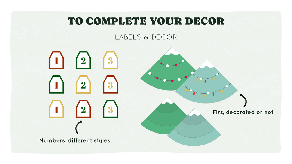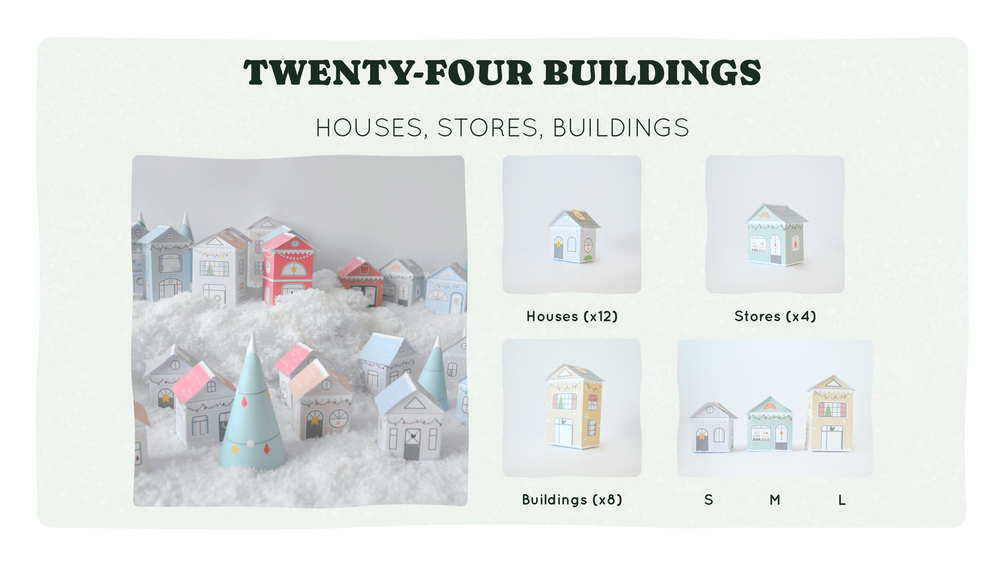 You will have 24 different building patterns: 12 houses (size S), 4 shops (size M), 8 buildings (size L). Also included in this kit : sheets of number labels as well as tree patterns to enhance your decoration.