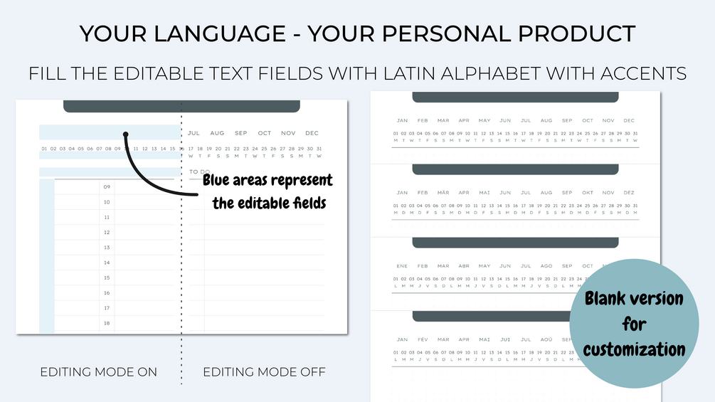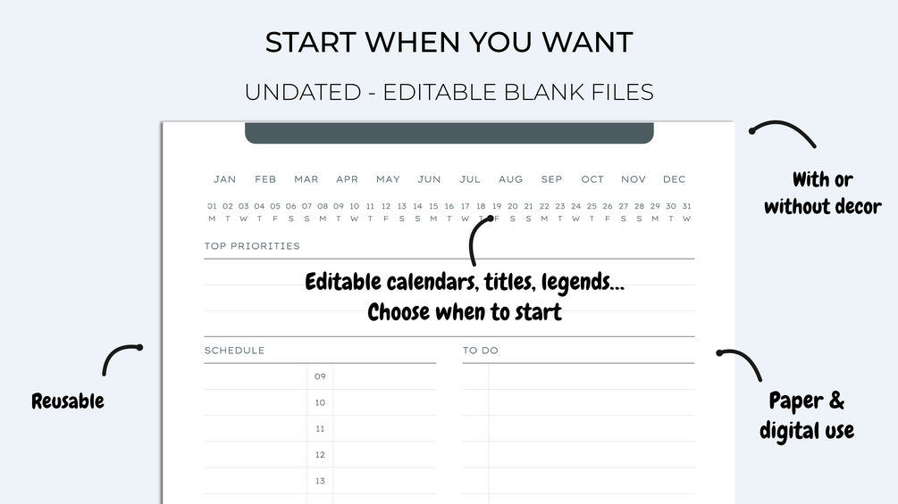 The files are empty of text and undated to allow you to fill them in at your convenience but also to reuse them for many years. Fill in the text fields from a PDF editor and create a planner that suits you and in your language.