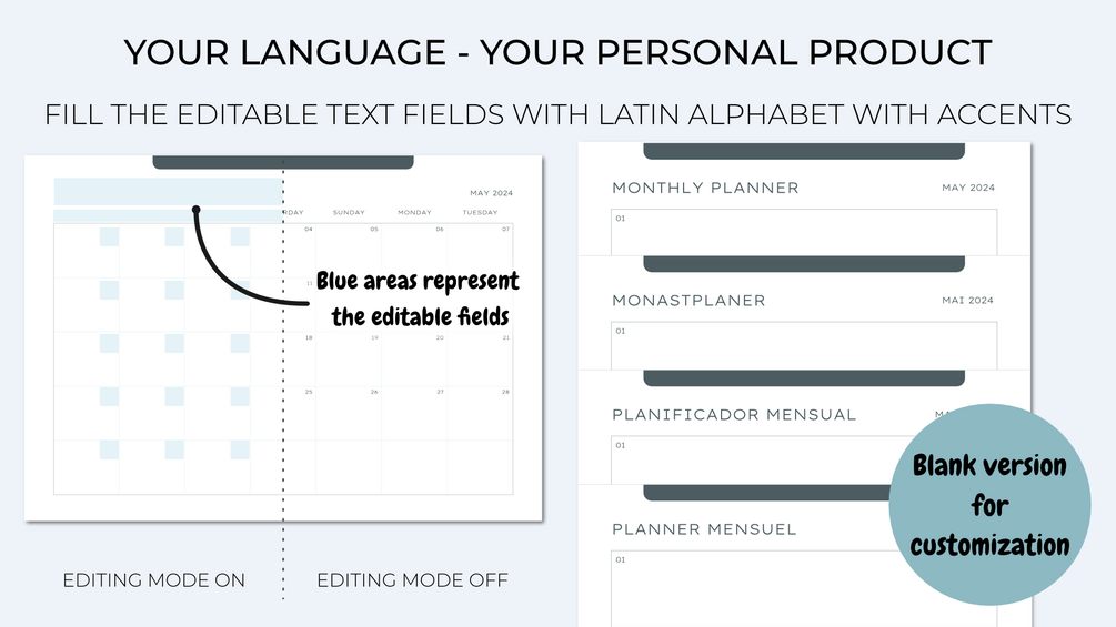 • If you wish to use editable files, you can directly type the desired text in the areas provided for this purpose (materialized by a blue background or a dotted border which will not appear on the printout). Once you have made your changes, simply save a copy and print your work.